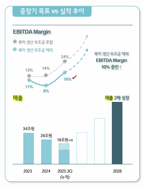 북미 생산보조금을 포함한 상각전영업이익(EBITDA) 마진 목표는 2023년 13%, 지난해 14%에서 올해 24% 수준까지 개선하는 것이다. 북미 생산보조금을 제외한 EBITDA 마진은 2027년 10% 중반 이상을 달성한다는 계획이다.