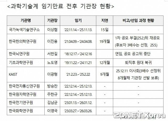 국가녹색기술연구소는 기관장 임기가 지난 13일까지였다. 또 한국전자통신연구원과 한국원자력연구원은 다음 달 13일 임기가 만료된다. 한국전기연구원장은 내년 1월 12일, 한국화학연구원장은 내년 3월 26일까지다.