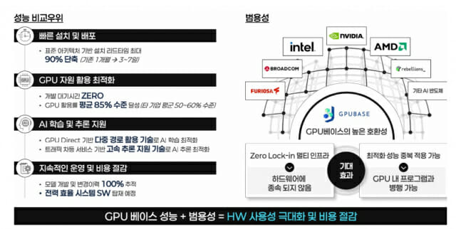 'GPU베이스(GPUBase)'는 GPU 자원을 세밀히 분할하고 처리 경로를 최적화해 대규모 연산 환경의 효율을 극대화한다. 엔비디아 기반 클러스터는 물론 AMD·인텔 GPU까지 포괄하는 폭넓은 호환성을 갖췄다. 국내 지능형 반도체 기업 리벨리온과의 공동 연구를 통해 NPU 기반 연산까지 확장 가능한 범용성을 확보 중이다.