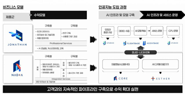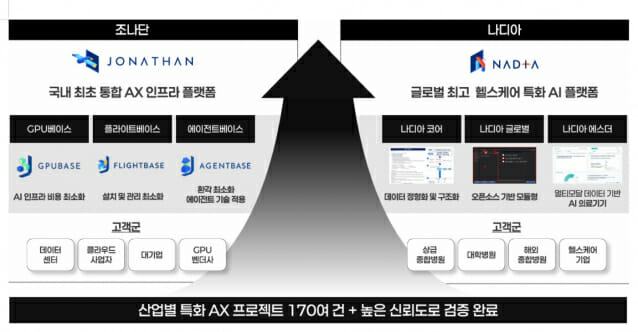 핵심 제품이자 플랫폼인 '조나단(JONATHAN)'은 GPU 성능을 극대화해 동일 자원으로 더 많은 모델을 빠르게 개발·배포·운영할 수 있게 해준다. 그만큼 기업의 AI 비용과 효율 구조를 개선해준다. 또 헬스케어 특화 플랫폼 '나디아(NADIA)'는 병원정보시스템(HIS) 연동부터 SaMD 기반 진단·예측까지 실제 임상 환경 및 기업에서 작동하는 AI 의사결정지원을 제공한다.