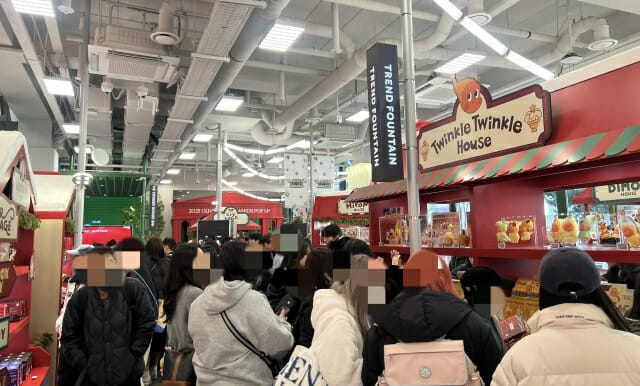 매장 안은 팝마트 캐릭터 조형물과 조명, 크리스마스 장식으로 가득 차 작은 테마파크 같은 분위기였다. 한 중국인 관광객은 장바구니에 라부부 인형과 키링을 담으며 “다른 매장에서는 구하기가 쉽지 않다”고 말했다.