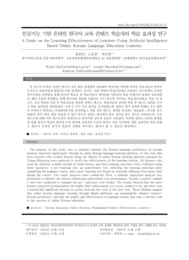 이번 연구 결과는 ‘인공지능 기반 온라인 한국어 교육 콘텐츠 학습자의 학습 효과성 연구’라는 제목으로 한국콘텐츠학회 논문지 제25권 11호에 게재됐다.