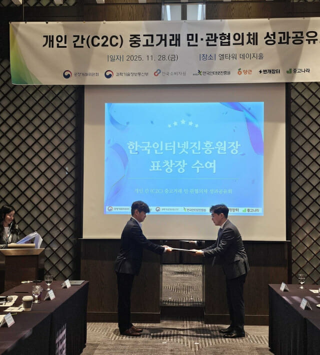 대한민국 대표 테크 리커머스 플랫폼 번개장터(공동대표 강승현·최재화)는 지난 28일 서울 양재 엘타워에서 개최된 ‘2025년 개인간(C2C)중고거래 민관협의체 성과공유회’에서, 중고거래 분쟁 환경에서의 이용자 권익 보호에 기여한 공로를 인정받아 한국인터넷진흥원 (KISA)으로부터 기관 표창을 수상했다고 1일 밝혔다. 이로써 번개장터는 3년 연속 표창을 받는 성과를 거뒀다.