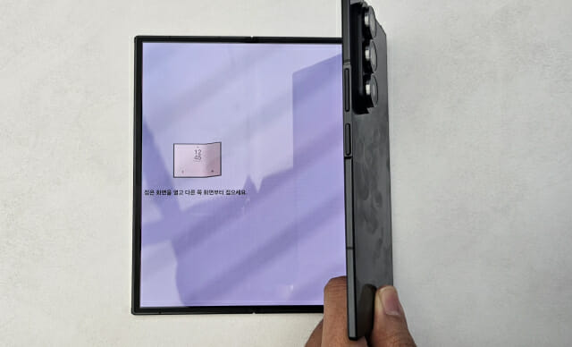 또한 갤럭시 Z 트라이폴드는 접는 순서를 다르게 했을 경우를 고려해, 이상이 감지되면 사용자에게 화면 알림과 진동으로 알려주는 자동 알람 기능도 탑재했다. 바깥쪽 화면을 먼저 접어보니 "접은 화면을 열고 다른 쪽 화면부터 접으세요"라는 문구와 함께, 손에 진동이 느껴졌다.