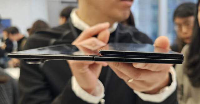 실제 제품을 관찰해 본 결과, 안정적인 제품 사용을 위한 디테일이 돋보였다. 갤럭시 Z 트라이폴드는 화면을 접을 때 두 디스플레이가 완전히 붙지 않고, 미세한 틈이 생기도록 설계됐다. 화면이 완전히 붙을 경우 화면을 열기 불편하고, 가운데 메인 디스플레이에 무리를 줄 수 있기 때문이다.