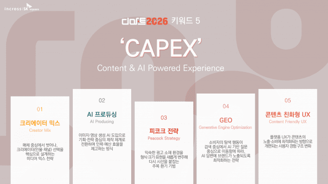 ‘케펙스’는 콘텐츠와 AI 기술이 결합해 디지털 마케팅 경험을 근본적으로 혁신한다는 의미를 담고 있다. 인크로스는 ▲크리에이터 믹스 ▲AI 프로듀싱 ▲피코크 전략 ▲GEO ▲콘텐츠 친화형 사용자 경험(UX)의 영문 글자를 조합해 핵심 키워드를 도출했다.