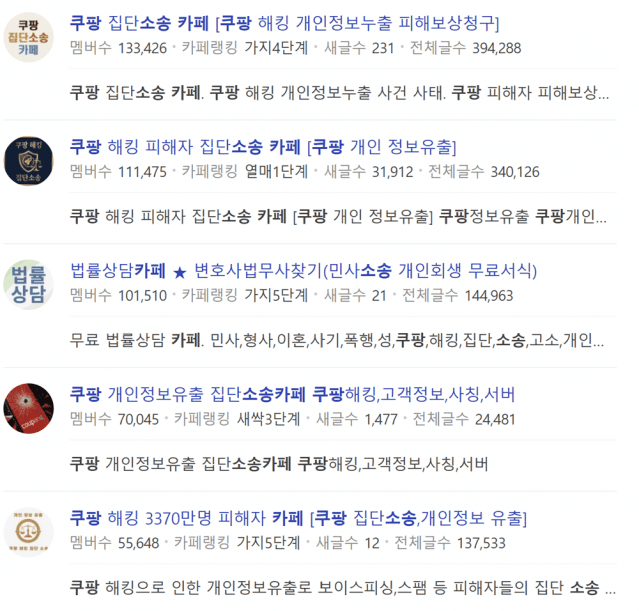 집단 소송 카페 역시 빠르게 회원 수가 늘고 있다. 현재 네이버에는 쿠팡 집단 소송을 위한 카페 10여개가 개설된 상태다. 가장 회원 수가 많은 곳은 13만 명을 넘어선다. 회원 수가 10만 명을 넘는 곳도 두 곳이나 더 있다.