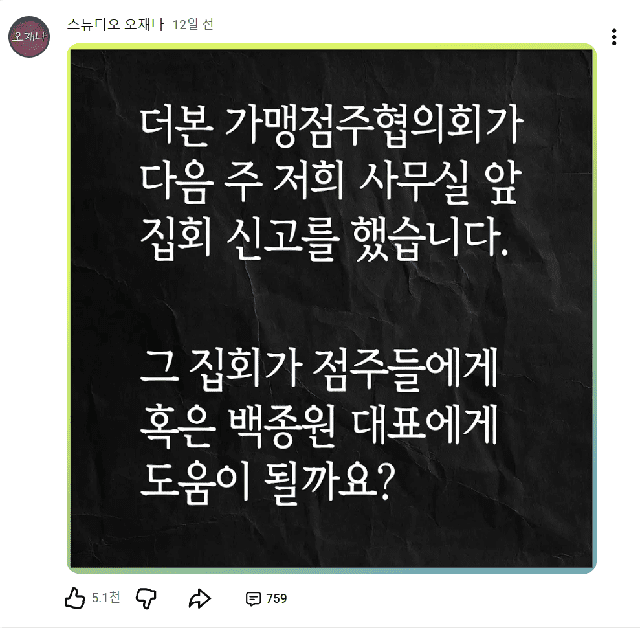 더본코리아 점주모임은 전가협뿐 아니라, 더본코리아 백종원 대표와 관련 의혹을 제기해 온 유튜브 채널 ‘스튜디오 오재나’ 사무실 앞에도 집회신고를 했다. 실제 집회가 열리진 않았지만, 점주들은 왜곡된 콘텐츠가 반복 확산되면서 점주들이 감당할 수 없는 매출 피해가 발생하고 있다고 주장했다.