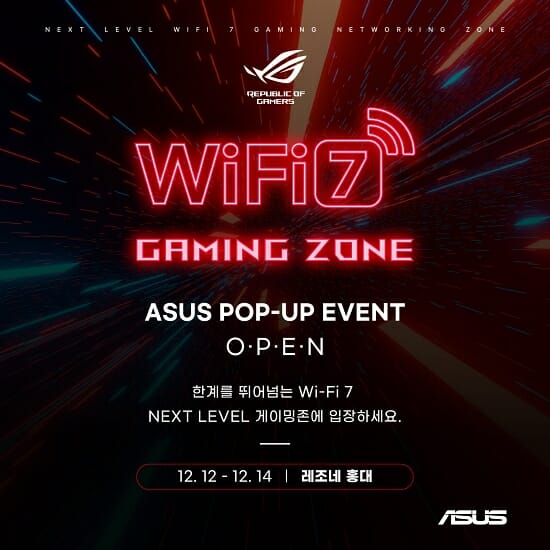 에이수스코리아가 12일부터 3일간 서울 연남동에서 고성능 유·무선 네트워크와 솔루션을 체험할 수 있는 'ROG 와이파이7 게이밍존'을 운영한다.