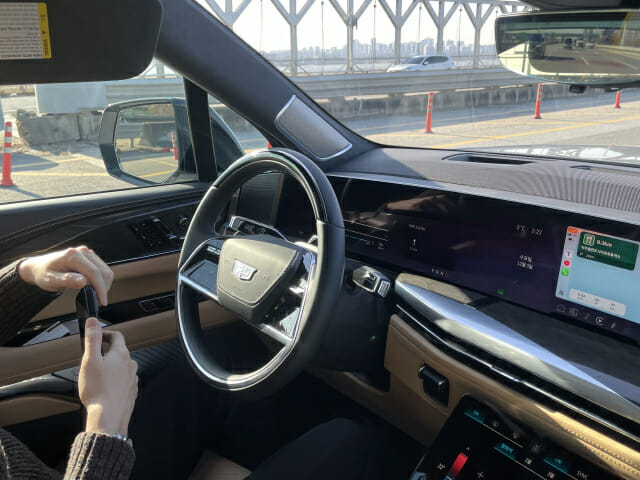 파주시 한 카페를 출발해 자유로에 접어들자 운전대 상단에 초록색 불빛이 켜졌다. 핸즈프리 자율주행 '슈퍼크루즈'가 활성화 가능한 상태다. 이때부터 운전자는 두 손을 떼고 차량의 자율 주행을 맡길 수 있다. 속도를 시속 120㎞로 설정해두자 거대한 캐딜락 에스컬레이드 IQ는 재빠르게 스스로 차선을 변경하며 주행을 이어갔다.