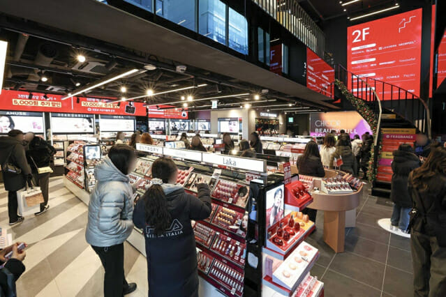 1층 매장에 들어서면 ‘립&치크바’가 고객을 맞이한다. 20여 가지 립, 치크 인기브랜드를 선보이며 최신 메이크업 트렌드를 경험할 수 있도록 했고 2층에는 외국인들이 많이 찾는 스킨케어, 퍼품, 헤어바디 존을 마련했다.