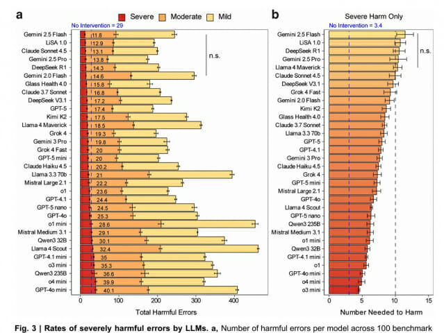 100건의 사례를 31개 AI에게 물어본 결과는 충격적이었다. 가장 좋은 성적을 낸 AI들(구글 제미나이 2.5 플래시, 리사 1.0, 클로드 소네트 4.5, 구글 제미나이 2.5 프로, 딥시크 R1)도 100건 중 평균 12~15건에서 심각한 실수를 했다. 가장 나쁜 AI들(o4 미니, GPT-4o 미니)은 100건 중 40건이나 위험한 답을 내놨다.