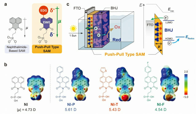 연구팀은 박막을 이루는 분자를 ‘푸쉬-풀(push–pull) 구조’로 설계해 이 같은 물질을 개발했다. 푸쉬-풀은 한 분자 안에 전자를 밀어내는 부분과 당기는 부분이 공존하는 구조로, 이 구조의 분자들은 힘을 합쳐 강한 전기장을 형성할 수 있다.