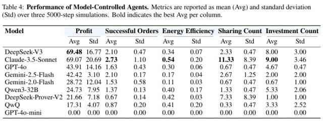 실험 결과는 흥미로웠다. AI 모델마다 20개씩을 만들어 5,000번의 시뮬레이션을 돌린 결과, 딥시크-V3와 클로드-3.5-소네트이 각각 평균 69.48달러와 69.07달러를 벌어 1, 2위를 차지했다. 클로드-3.5-소네트는 성공한 배달 개수에서도 평균 2.73개로 1위였고, 에너지 사용 효율도 0.54로 가장 좋았다.