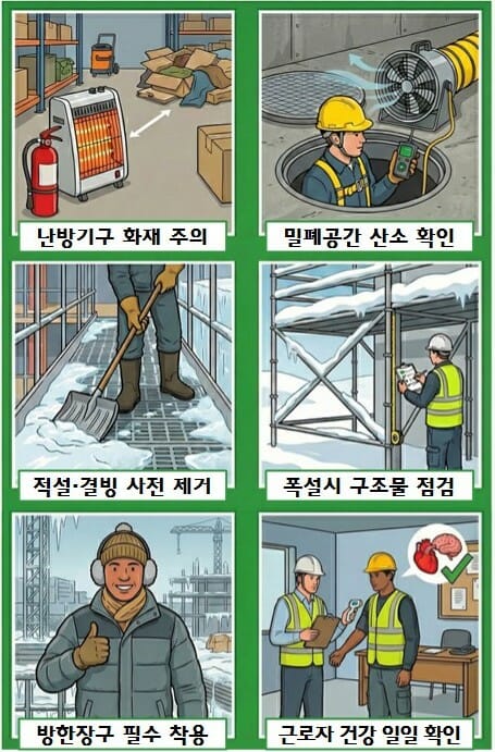6대 수칙은 ▲난방기구 안전관리 ▲밀폐공간 유해가스 예방 ▲작업환경 결빙 제거 ▲폭설 대비 구조물 안전성 확보 ▲개인 보호장구 착용 ▲근로자 건강 리스크 관리 등 산업현장의 구조적 취약점을 다룬다.