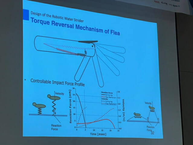 그는 "이런 작은 스케일의 로봇을 만들 수 있으면, 실제 소금쟁이는 60mg 정도 되는데 이 로봇은 한 30mg 정도 된다"며 "실제 소금쟁이가 뛸 때의 힘 프로파일을 정확히 미미킹할 수 있는 로봇"이라고 말했다.
