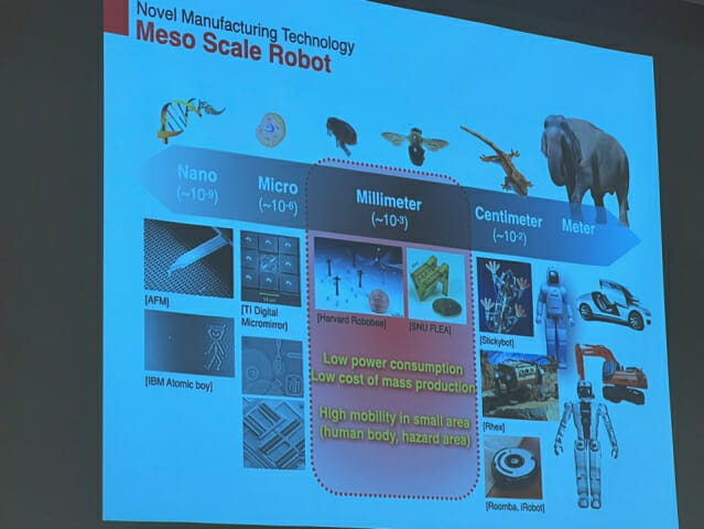 고 교수는 이날 '기계적 지능을 기반으로 한 생체 영감 마이크로 로봇'을 주제로 발표에 나섰다. 그는 "여기서 가장 중요한 부분은 마이크로 로봇인데 실제 사이즈가 마이크론 정도는 아니고 실제 크기는 한 밀리미터 스케일, 그러니까 곤충용 스케일이라고 보시면 된다"고 설명했다.