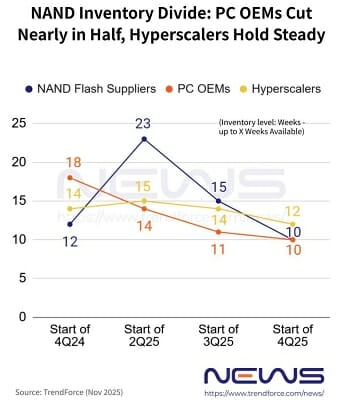 시장조사업체 트렌드포스도 자체 집계 자료를 바탕으로 "지난 해 10월 기준 낸드 플래시메모리 공급 업체의 재고는 12주 분, PC 제조사의 재고는 18주 수준이었지만, 올 10월에는 공급 업체 재고와 PC 제조사 재고 모두 10주 수준으로 하락했다"고 밝혔다.