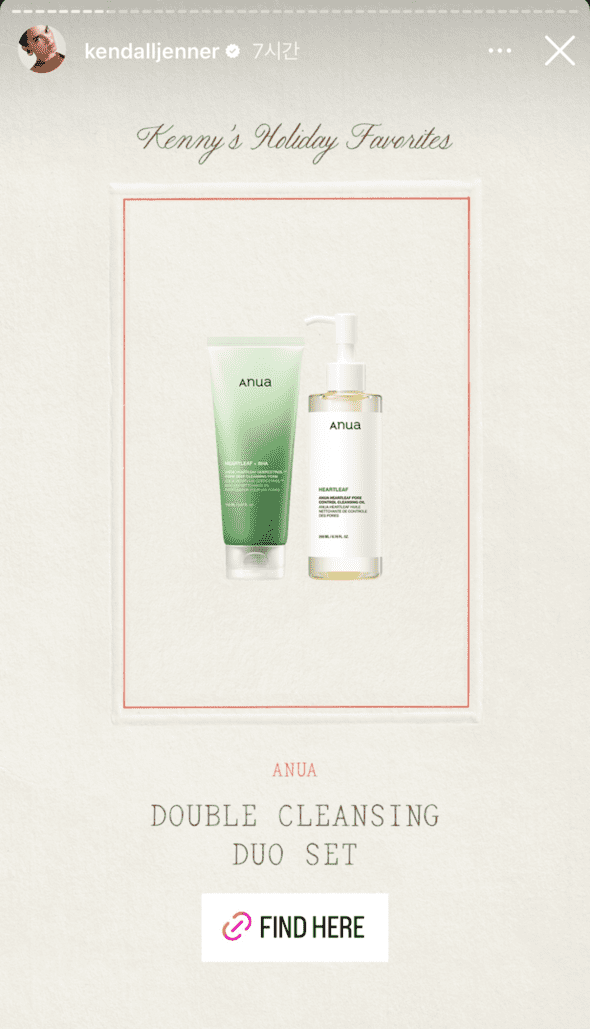 켄달 제너는 지난 10일(한국 시간) 자신의 인스타그램 스토리에 ‘WHAT I’M LOVING THIS HOLIDAY’라는 문구와 함께 연말 시즌 애정하는 제품들을 공개했다. 이 중 아누아의 ‘더블 클렌징 듀오’를 ‘Kenny’s Holiday Favorites’라 소개하며 연말 최애템으로 언급했다.
