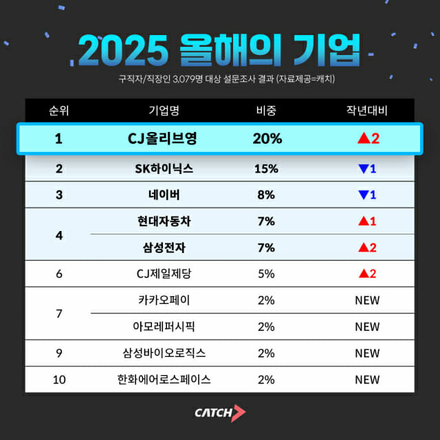 진학사 캐치 김정현 본부장은 “매년 진행하는 올해의 기업 조사는 그 해 산업 전반의 흐름과 구직자 인식을 가장 잘 반영하는 지표”라며 “올해는 브랜드력과 소비자 접점이 강한 CJ올리브영이 새로운 1위로 부상했다는 점이 특히 눈에 띈다”고 말했다.