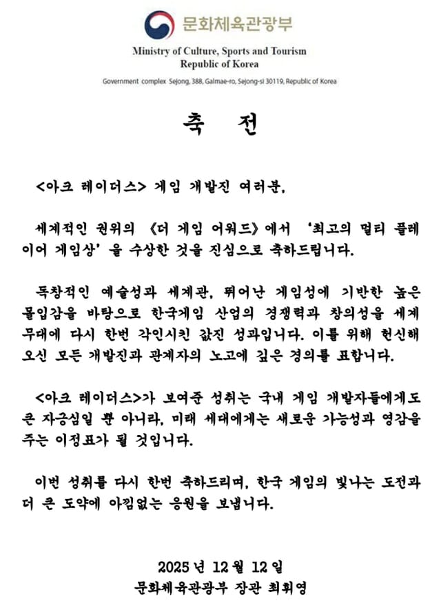 최휘영 장관은 아크 레이더스 개발진에게 “이번 수상은 독창적인 예술성과 세계관, 뛰어난 게임성을 통해 높은 몰입감을 구현한 결과로 한국 게임산업의 경쟁력과 창의성을 세계 무대에 다시 한번 각인시킨 값진 성과다”라고 전했다.