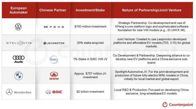폭스바겐뿐 아니라 스텔란티스, 아우디, 재규어랜드로버(JLR), BMW, 메르세데스-벤츠 등 다른 유럽 전통 완성차 업체들도 중국 현지 자동차 회사에 대한 투자나 전략적 제휴를 확대하고 있다. 중국 시장 점유율을 유지하고, 현지 생산을 통해 비용을 낮추며, 첨단 전기차·소프트웨어 기술에 접근하기 위한 선택이다.