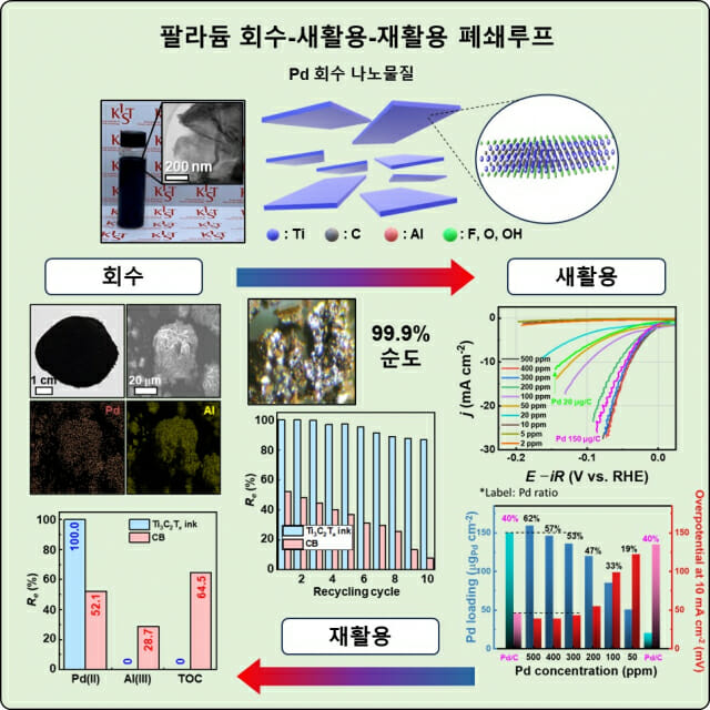 회수된 팔라듐-나노시트 복합체는 다시 수소 발생 촉매로 재활용할 수 있어 귀금속 완전 순환 시스템 구현도 가능하다.