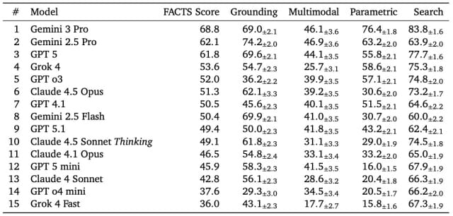 측정 결과 가장 높은 점수를 기록한 AI 챗봇은 ‘제미나이 3 프로’로 정확도 69%를 기록했다. 이어 ▲제미나이 2.5 프로(62%) ▲GPT 5(62%) ▲그록 4 (54%) ▲GPT o3(52%) ▲클로드 4.5 오퍼스 등(51%) ▲GPT 4.1(51%) 순으로 집계됐다. 세부 평가 항목 별로는 차트, 이미지를 읽는 멀티모델 평가 부문이 가장 낮은 점수를 기록했다.