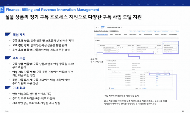 SAP는 최근 실물 상품을 정기 구독 형태로 판매·관리할 수 있는 기능을 ERP에 처음으로 추가했다. 기존 소프트웨어(SW) 중심의 구독 모델을 커피, 소모품, 부품 등 실제 배송이 필요한 상품까지 확장했다.