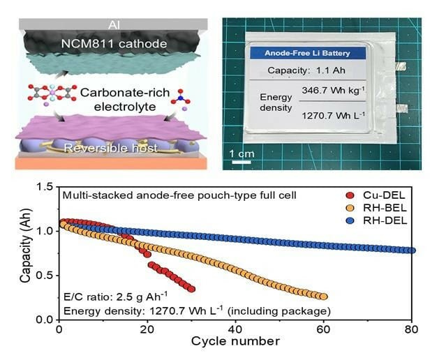 이 둘을 결합한 RH-DEL 시스템은 높은 용량(4.6mAh/㎠)과 전류 밀도(2.3mA/㎠) 조건에서 100회 충·방전 후에도 초기 용량의 81.9%를 유지했고, 평균 99.6%의 높은 에너지 효율을 기록했다. 이러한 안정적인 성능을 바탕으로 연구팀은 무음극 리튬금속전지에서 부피 에너지 밀도 1천270Wh/L를 구현하는 데 성공했다.