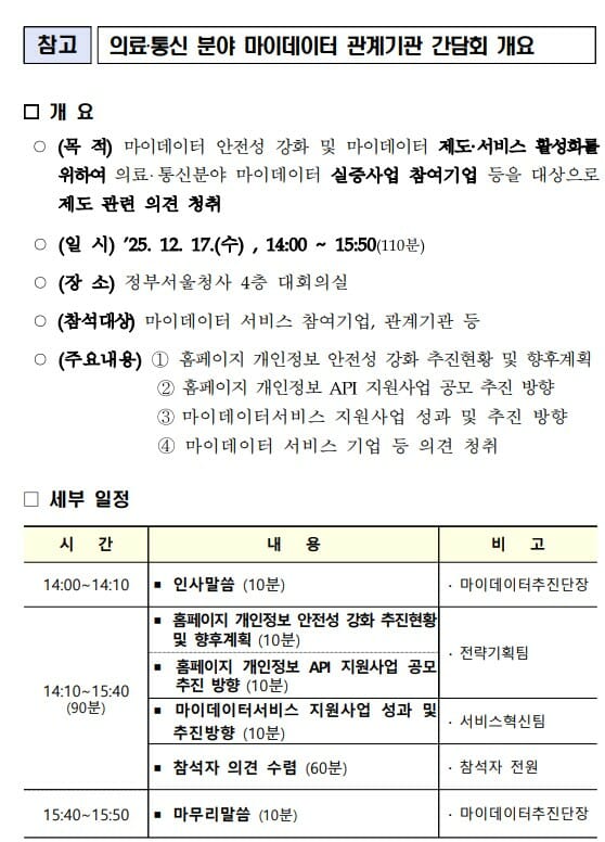 이번 간담회는 최근 쿠팡 등 이커머스 업계의 반복된 정보유출 사고에 따라 전 분야 마이데이터 추진 과정에서의 안전성을 점검하고 ▲개인정보 전송 안전성 강화 ▲홈페이지 개인정보 API 지원사업 추진 방향 ▲마이데이터 서비스 지원 성과 및 추진 방향 ▲제도·서비스 활성화 방안 등 세부과제에 대한 의견을 수렴하기 위해 마련됐다. API(application Programming Interface)는 응용프로그램 간 데이터를 주고받는 방법을 말한다.