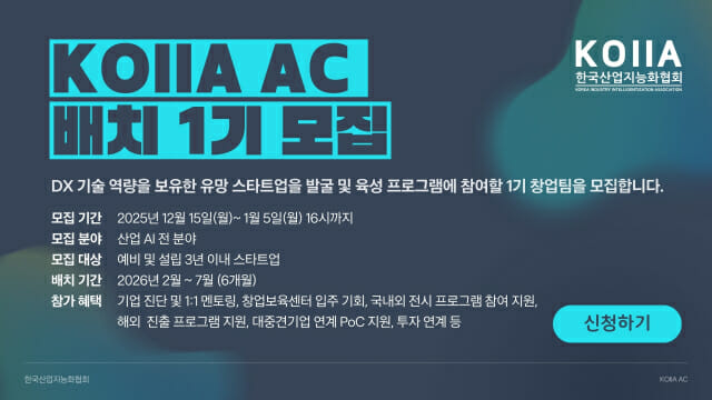한국산업지능화협회(KOIIA)는 산업인공지능전환(산업AX) 역량을 보유한 초기 기술창업기업을 대상으로 내년 1월 5일까지 창업팀을 모집해 KOIIA AC 배치 프로그램을 운영한다고 17일 밝혔다.