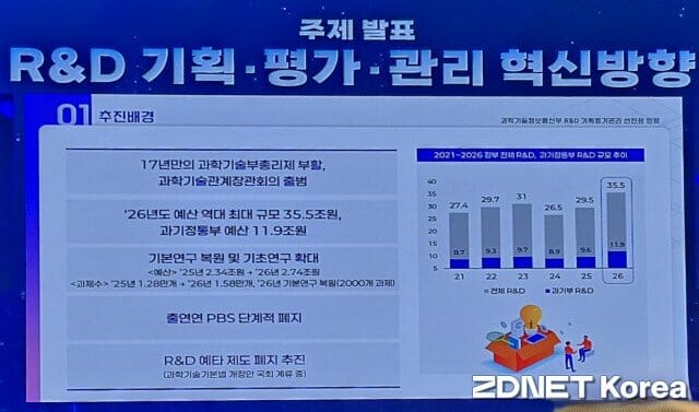 윤 과장은 R&D 기획·평가·관리 혁신 추진 배경으로 ▲17년 만의 과학기술부총리제 부활 및 과기관계장관회의 출범 ▲2026년 R&D 예산 35.5조 원 ▲기본 연구 본원 및 기초연구 확대(2026년 과제 1만 5천8백 개) ▲PBS(연구과제중심제) 단계적 폐지 ▲R&D 예타 폐지 등을 꼽았다.