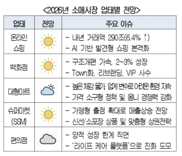 대한상공회의소는 ‘2026 유통산업 전망 세미나’를 열고 온라인쇼핑·백화점·슈퍼마켓(SSM)은 내년에 성장세를 보이겠으나 대형마트와 편의점은 주춤할 것으로 평가했다.
