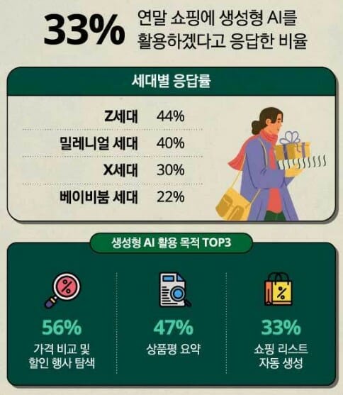 글로벌 컨설팅 기업 딜로이트(Deloitte)가 발표한 리포트에 따르면, 올해 연말 쇼핑에 생성형 AI를 활용하겠다는 응답이 33%로 전년(15%) 대비 2배 이상 증가했다. 경기 둔화와 물가 상승 우려 속에서도 디지털 툴을 활용한 스마트 쇼핑이 새로운 트렌드로 자리 잡고 있다.