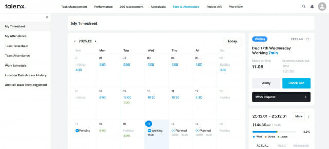 HCG의 탈렌엑스는 ▲성과·평가 ▲인사관리 ▲근무관리 ▲급여관리 ▲워크플로우 등 주요 기능을 갖춘 올인원 HR SaaS 플랫폼이다. 기업 규모에 관계없이 유연하게 활용할 수 있다. 최신 클라우드 기술을 기반으로 도입 기간과 비용을 최소화할 수 있으며, 특히 AI 기반 분석과 HR 트렌드 반영 기능을 통해 글로벌 HR 환경에 최적화된 서비스를 제공한다.
