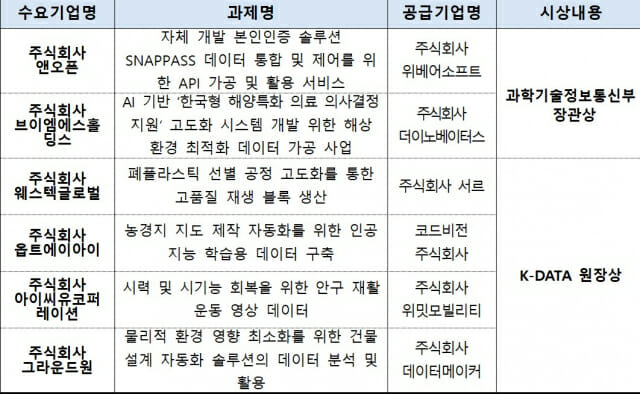 이날 시상식에서는 '데이터바우처 수요기업 우수사례'에서 최고 좋은 성적을 낸 앤오픈(대표 이준구)과 브이엠에스홀딩스(대표 김지석) 두 곳이 영예의 과기정통부 장관상을 받았다. 또 웨스텍글로벌(대표 최아연), 옵트에이아이(대표 이재호), 아이씨유코퍼레이션(대표 김동혁), 그라운드원(대표 홍윤정) 4개사는 K-DATA 원장상을 각각 수상했다.