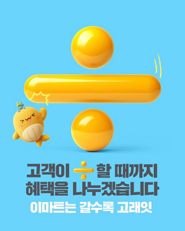 새로운 슬로건은 ‘고객이 응(÷)할 때까지 혜택을 나누겠습니다. 이마트는 갈수록 고래잇’으로 정했다. 내년에는 혜택을 더욱 크게 나누겠다는 의미다.