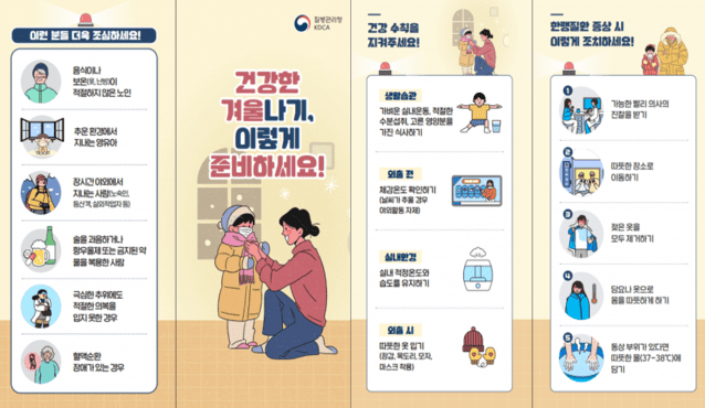 임승관 질병청장은 “고령층과 만성질환자들은 한파 대비 건강 수칙을 잘 숙지하고 준수해달라”라며 “한파 특보 발령 시 외출 등 야외 활동에 대한 자제가 필요하다”라고 강조했다. 아울러 “보호자는 어르신들이 한파에 노출되지 않도록 살펴달라”라고 당부했다.