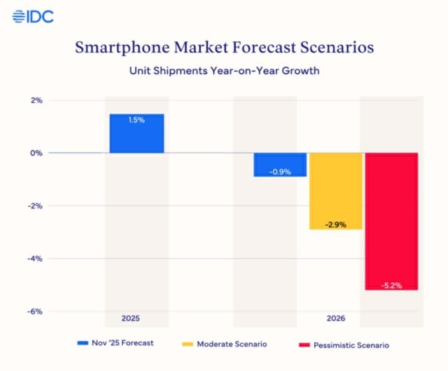 스마트폰 시장의 역시 메모리 가격 상승 영향으로 2026년 시장 규모가 전년 대비 2.9% 감소할 수 있으며 상황이 악화될 경우 감소 폭은 최대 5.2%까지 확대될 수 있다고 IDC는 전망했다. 평균 판매 가격은 완만한 시나리오에서도 3~5% 상승이 예상되며, 공급 압박이 심해질 경우 6~8% 수준까지 오를 가능성이 제기됐다.