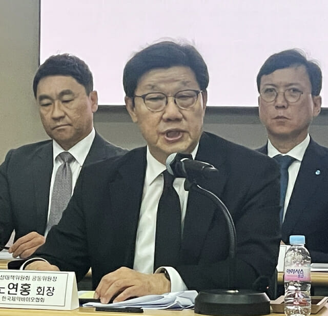 이날 기자회견에는 ▲김영주 종근당 대표 ▲류형선 한국의약품수출입협회장 ▲노연홍 제약바이오협회장 ▲윤웅섭 제약바이오협 이사장 ▲조용준 한국제약협동조합 이사장 ▲이재국 제약바이오협 부회장 등이 참석했다.