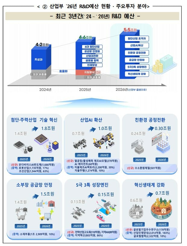 산업부는 ’25년대비 18% 증액된 역대 최대규모인 총 5.5조원을 지원한다. 신규 지원과제는 ’25년대비 85% 증가한 1.4조원을 투자한다. 지원 분야별로는 ❶반도체·이차전지·바이오·미래차·로봇·조선 등 첨단·주력산업 기술혁신에 1조 8325억원(증액28%) ❷AI팩토리, 피지컬AI 등 산업 AI 확산 기술(M.AX)에 1조 455억원(증액52%) ❸수소환원제철 등 친환경 공정전환 기술에 2990억원(증액24%) ❹경제안보를 위한 소부장 공급망 안정화에 1조 4914억원(증액7%), ❺지역전략산업 육성 등 5극3특 성장엔진에 1528억원(증액14%) ❻우수인재양성, 글로벌 협력 등 혁신생태계 강화에 7040억원(증액16%)을 지원한다.
