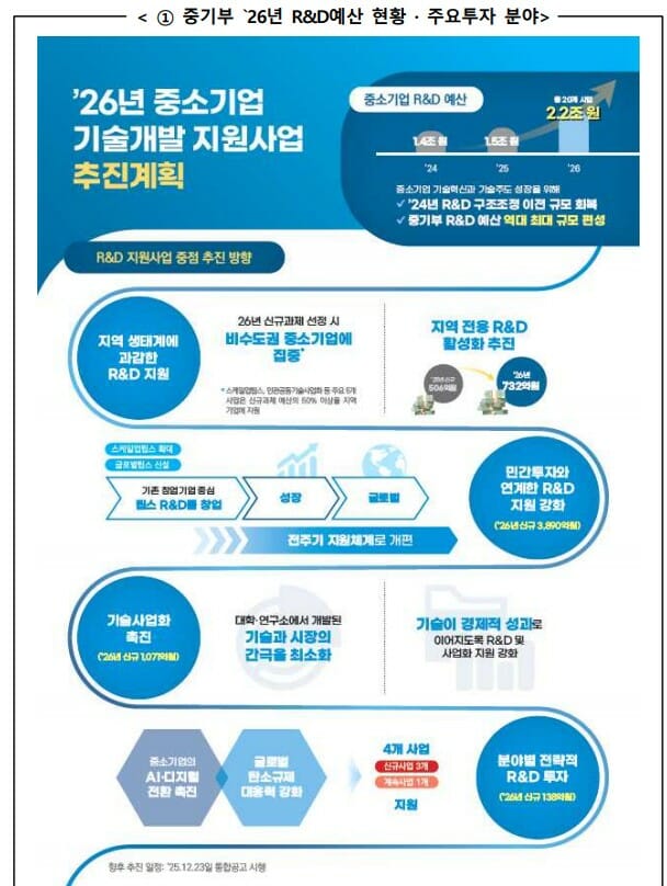 중소벤처기업부(장관 한성숙, 이하 중기부)와 산업통상부(장관 김정관, 이하 산업부)는 양 부처가 추진하는 R&D사업의 지원내용·대상·절차·일정 등을 담은 ‘26년도 R&D사업 통합시행계획(이하 통합시행계획)’을 함께 공고한다고 22일 밝혔다.