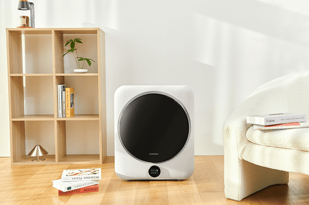 쿠쿠 미니케어 건조기는 3kg 용량에 배기호스가 필요 없다. 심플하고 세련된 외관으로 인테리어와의 조화도 고려했다. 전면부에는 LCD 디스플레이와 퀵 다이얼을 적용했다.