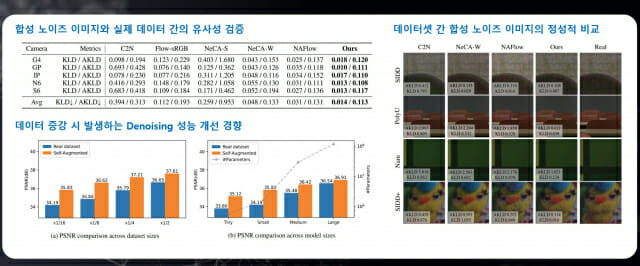 연구팀은 가이드노이즈의 성능을 검증하기 위해 세계적으로 통용되는 노이즈 데이터셋인 SIDD 등을 활용해 비교 실험을 진행했다. 논문에 따르면 노이즈의 실제 유사도를 나타내는 지표인 ‘평균 쿨백-라이블러 발산(AKLD)’ 평가에서 가이드노이즈는 0.113을 기록했다.