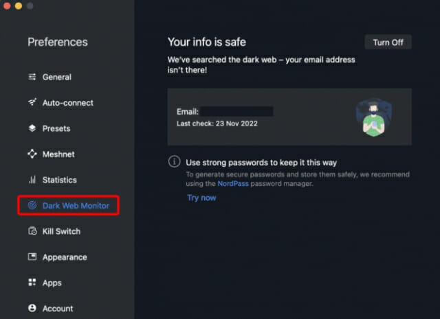 노드VPN의 '다크웹 모니터링'은 사용자의 이메일 주소와 연동된 계정 정보가 다크웹 장터나 해커 포럼 등에 노출되는지 24시간 감시한다.