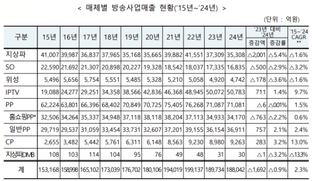정보통신정책연구원의 강준석 연구위원은 “미디어 선택권과 미디어 이용 시간은 역대 최고 수준에 올랐고, K콘텐츠의 대내외적 위상도 사상 최고 수준에 올랐다”면서도 “전체 방송시장 규모는 2022년을 정점으로 2년 연속 역성장을 기록했고, IPTV와 PP 등 성장하고 있는 일부 서비스도 성장률이 크게 둔화됐다”고 진단했다.