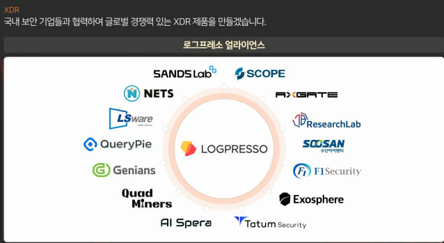 로그프레소는 글로벌 기업과 대항하기 위해 국내 보안 벤더들과 힘을 합쳐 ‘로그프레소 얼라이언스’라는 협력체를 구성했다. 이 얼라이언스에는 현재 샌즈랩, 지니언스, 엑소스피어, 엑스게이트, 쿼드마이너, AI스페라, 수산아이앤티, LS웨어, 퀘리파이, 넷츠(NETS), 테이텀시큐리티, F1시큐리티, 리서치랩, 스코프, 14개 국내 보안기업이 참여하고 있다. 양 대표는 "국내 보안 시장을 리드하고 있는 이들 기업과 협업해 글로벌 제품과 대항할 수 있는 XDR 플랫폼을 출시하겠다"면서 "글로벌 기업의 XDR 대다수가 제공하지 않는 경량 거대언어모델(sLLM) 기반 기술과 내부(폐쇄)망 운영이 우리 회사의 차별화된 경쟁력"이라고 들려줬다.