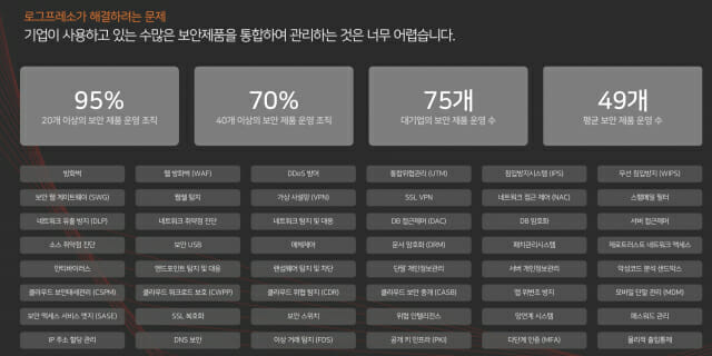 양 대표는 회사 경쟁력으로 '통합 보안'을 꼽았다. 국내 기업 과 기관이 많은 수의 보안제품을 사용하는데, 이들을 통합 보안할 수 있다는 것이다. 실제, 한 시장조사기관에 따르면 국내 대기업은 평균 75개의 보안 제품을 사용하고 있다. 또 40개 이상 보안 제품을 운영하고 있는 조직이 70%에 달했고, 95% 조직이 20개 이상 보안 제품을 보유, 운영하고 있다.