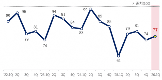 28일 대한상공회의소에 따르면 전국 2천208개 제조기업을 대상으로 ‘새해 1분기 기업경기전망지수(BSI)’를 조사한 결과, 전망치는 직전 분기(74)보다 3p 오른 77로 집계됐다. BSI는 2021년 3분기 이후 18분기 연속 기준치(100)를 하회했다. 관세 충격으로 급락했던 수출기업 전망지수는 16p 상승한 90을 기록했지만, 내수기업은 74에 그치며 전체 지수의 발목을 잡았다.